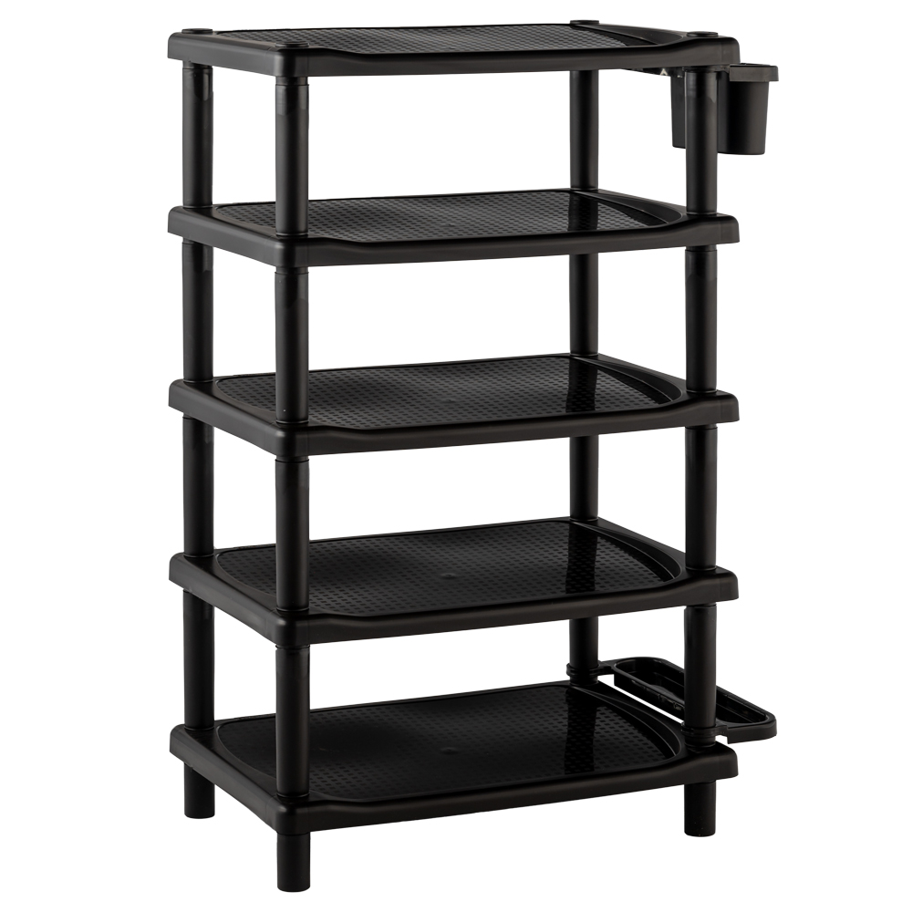 Этажерка для обуви "Элластик" узкая пластиковая. У изделия пять полок с рифленой противоскользящей поверхностью, предусмотрено два эргономичных лотка для губок, щеток и других аксессуаров. Цвет изделия представлен в ассортименте.