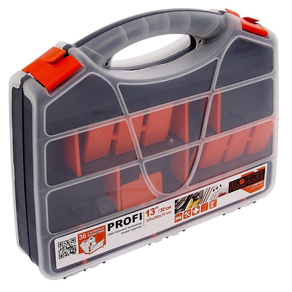 Двусторонний органайзер "Profi" выполнен в форме кейса, служит для хранения и переноски крепежа и мелких деталей.
