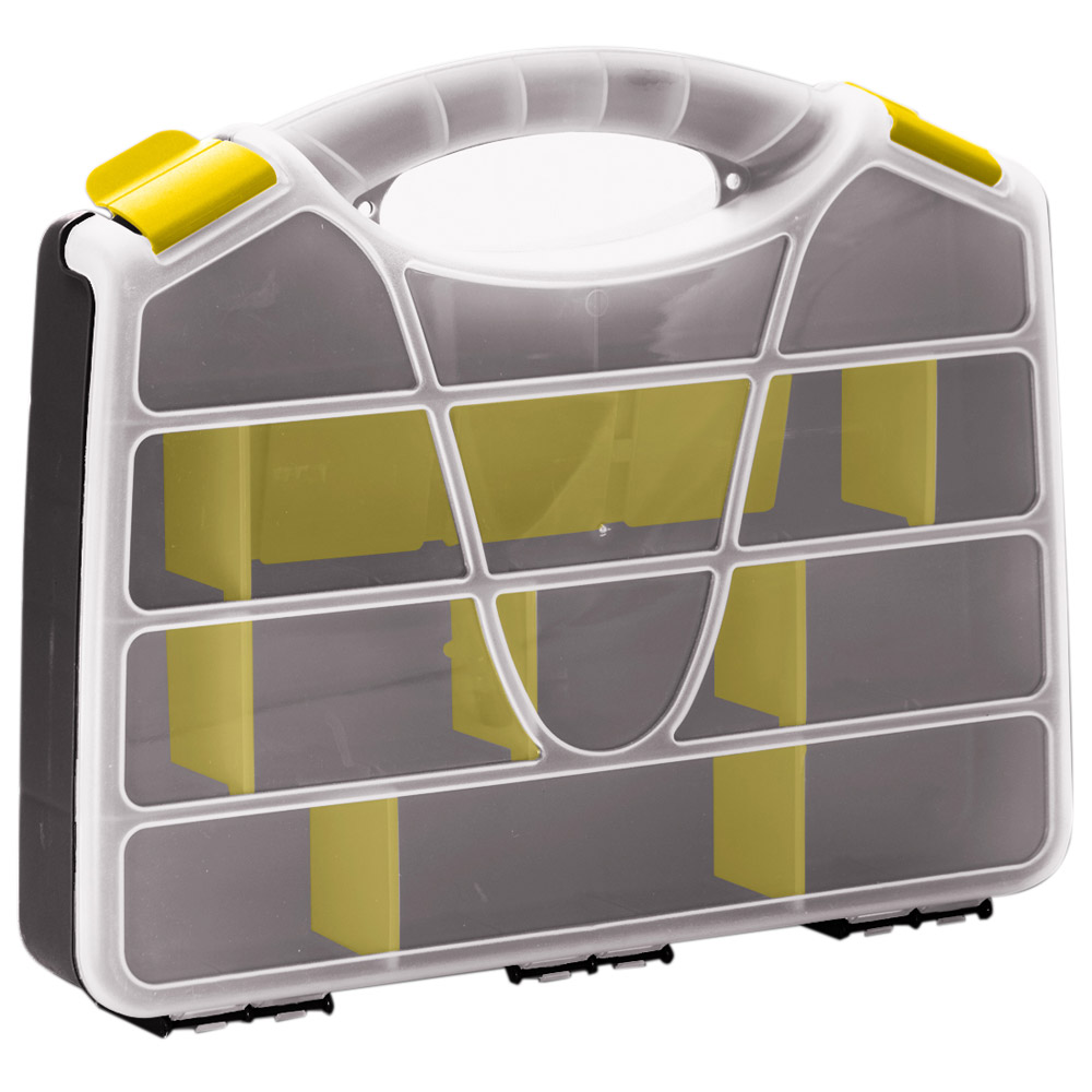 18 съёмных перегородок с каждой стороны позволяют изменять размер отсеков под личные нужды. Прозрачная крышка позволяет увидеть содержимое, не открывая органайзер.