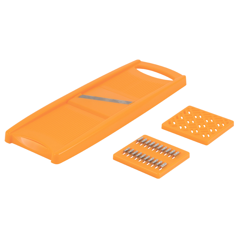 • слайсер с металлическими ножами-вставками, для нарезки ломтиков и шинковки капусты;