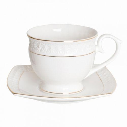 В этой паре классическая форма чашки сочетается с современной квадратной формой блюдца, белую керамику идеально дополняет золотая отводка, а бордюр украшен изысканным рельефом в виде снежинок.