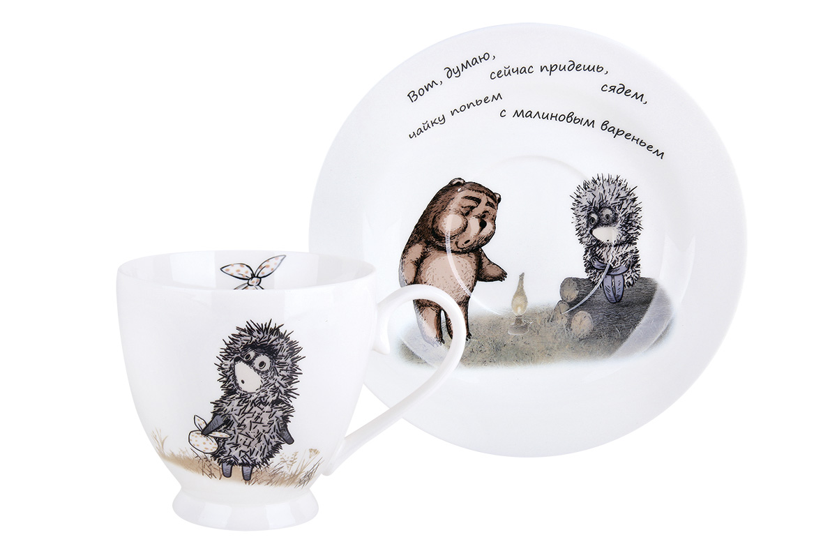 Чайная пара "Ежик в тумане" с оригинальным дизайном, украшенные рисунками персонажей знаменитого мультфильма. Элегантный вид и удобная ручка позволяют ее использовать для подачи горячих и холодных напитков. Изделие выполнено из тонкостенного фарфора