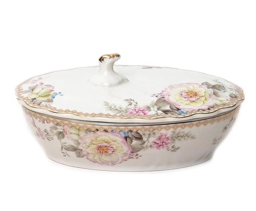 Предмет сервировки стола - паштетница с крышкой. Выполнена из высококачественного фарфора нового поколения, благодаря современным технологиям фарфор New Bone China не уступает традиционному костяному фарфору в прозрачности, белизне и прочности, но при этом гораздо экологичнее в производстве. Рекомендуется ручная мойка. Нельзя использовать в СВЧ-печи.