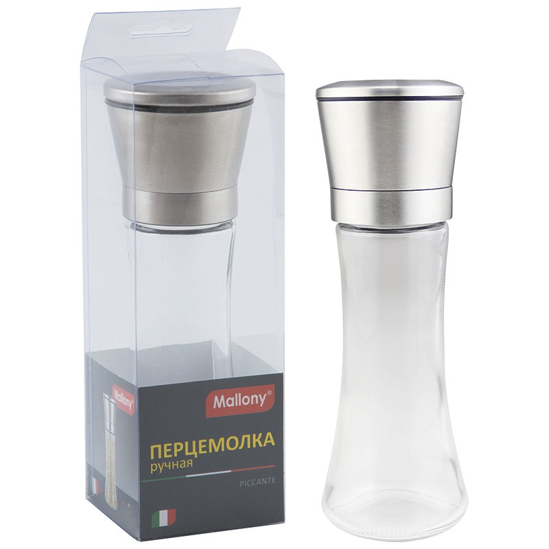 Перцемолка ручная Mallony Piccante предназначена для ручного помола крупной соли и всех видов перца горошком. Размеры: 6,5х19 см, 285 грамм, объем 185 мл. Материалы: стекло, нерж сталь 201 жернова - грубая керамика.