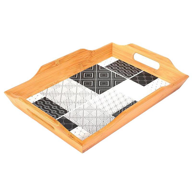 Деревянный поднос с высокими бортиками и геометрическим декором на дне украсит ваш интерьер.