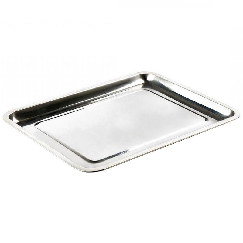 Прямоугольный поднос выполнен из нержавеющей стали.