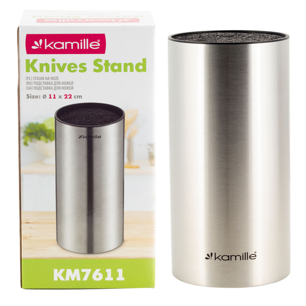 Подставка для ножей размером 11х11х22 см с наполнителем из черного пластика.