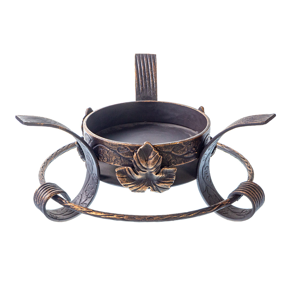 Кованая подставка под садж ручной работы. Подставка предназначена для подачи готового блюда в металлическом садже на стол и поддержания его горячим. В подставке есть специальная емкость для углей, свечи или мармитного топлива, благодаря которым пища при подаче на стол не остывает, и гости получают максимум удовольствия от ее великолепного аромата.