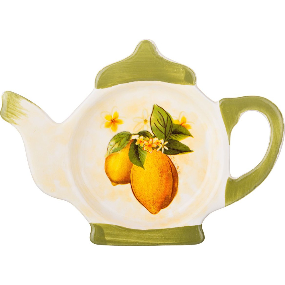 Подставка для чайных пакетиков, выполненная в форме чайничка с изображением лимонов, изготовлена из высококачественной керамики. Изделие придется по вкусу любой хозяйке, так как кухонный стол всегда останется чистым, без нежелательных разводов от чайных пакетиков.