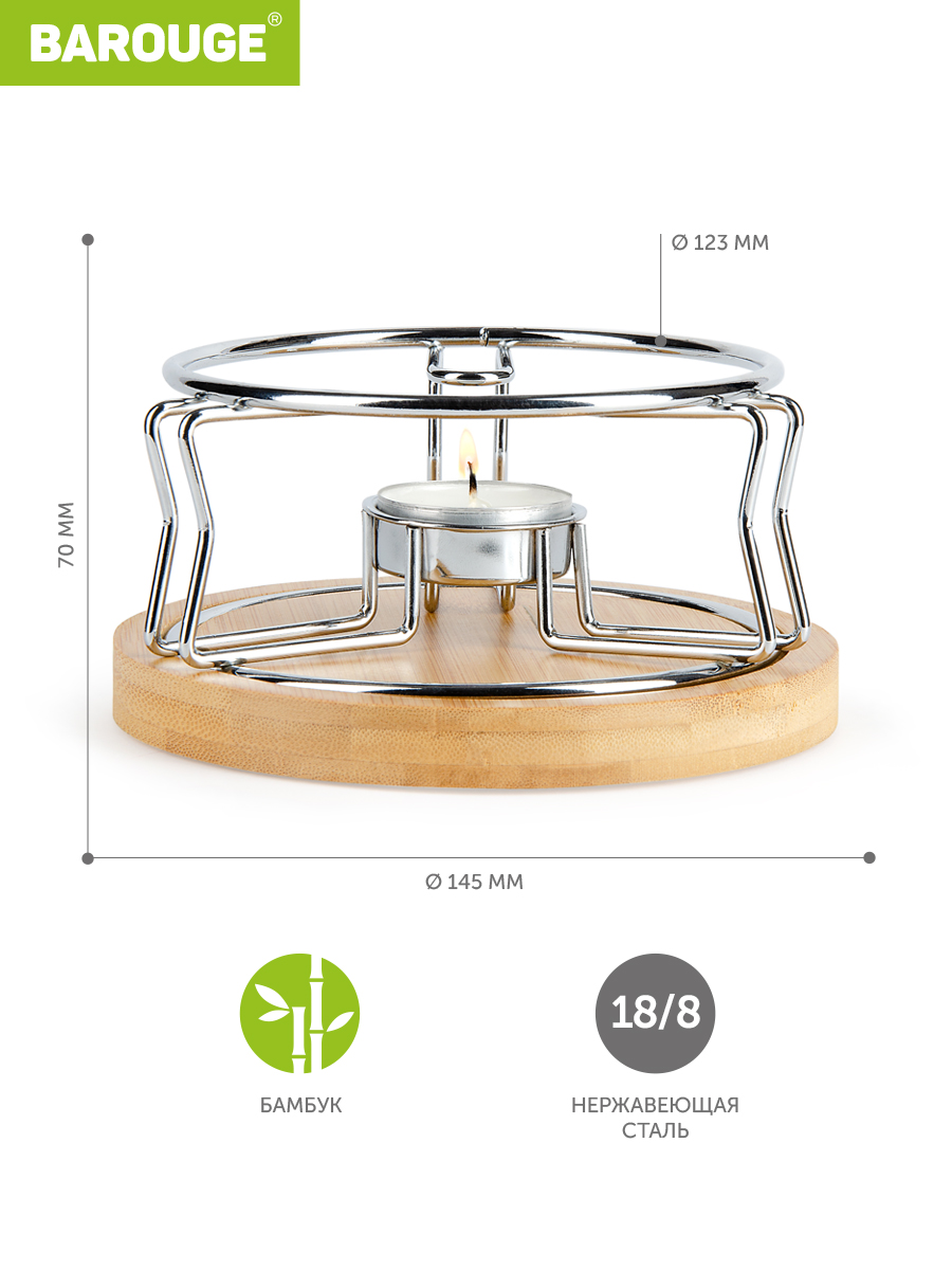Подставка-подогреватель для чайника Barouge изготовлена из прочной нержавеющей стали и дерева.