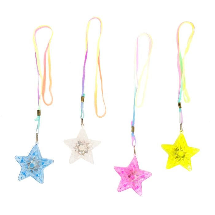 Ожерелье со светящимся кулоном Звезда. Изделие состоит плотного шнурочка и звездочки из пластика, внутри которого расположен светящийся элемент. Звездочку можно включать и выключать.