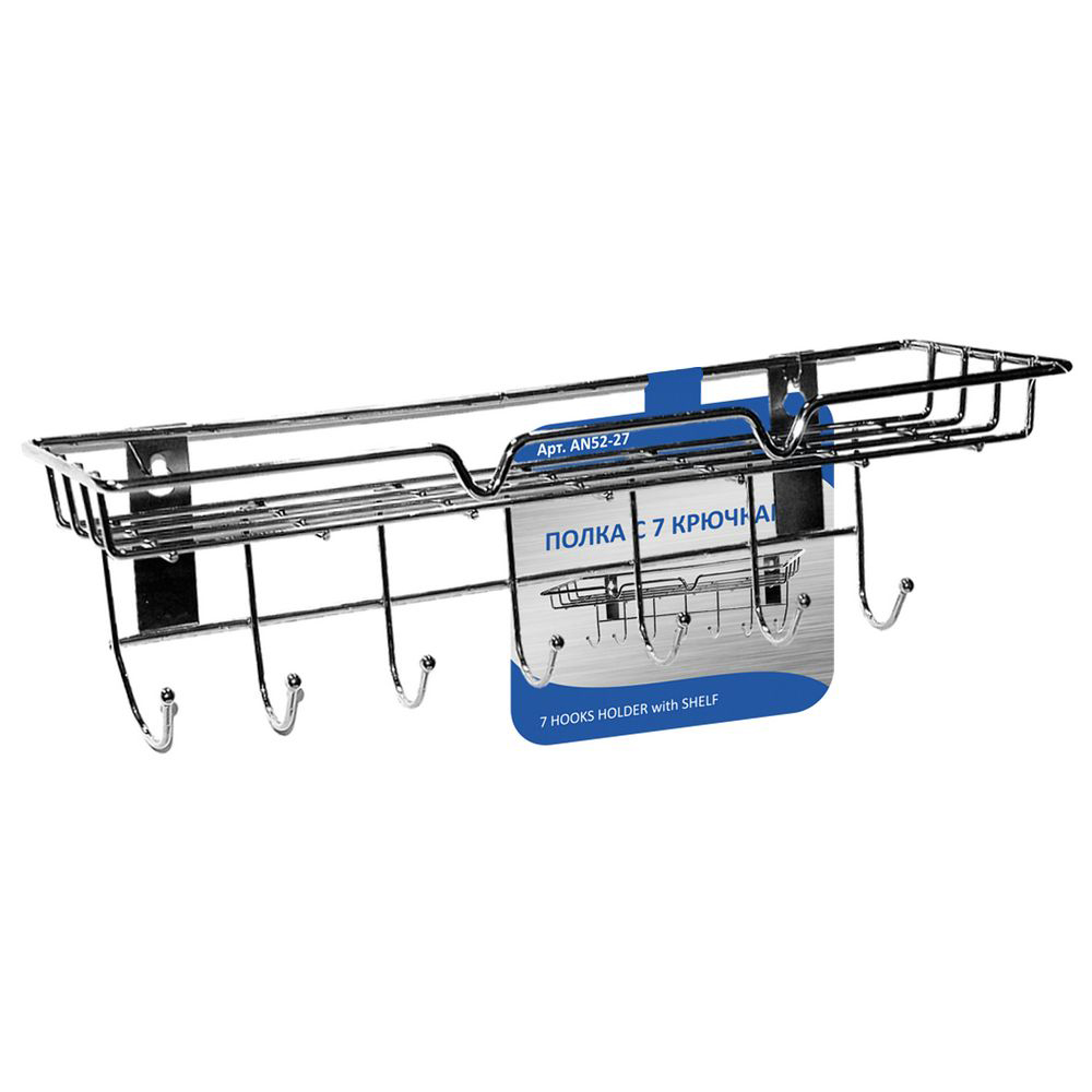 Удобная полка с 7 крючками – универсальное приспособление для ванной комнаты и кухни. Позволяет разместить моющие средства, мочалки, губки, щетки, развесить полотенца, прихватки, кухонную утварь и другие принадлежности. С этим изделием домашние мелочи всегда будут под рукой и содержаться в порядке. Подойдет для любой кухни или ванной комнаты, занимает мало места. Длина 29 см.