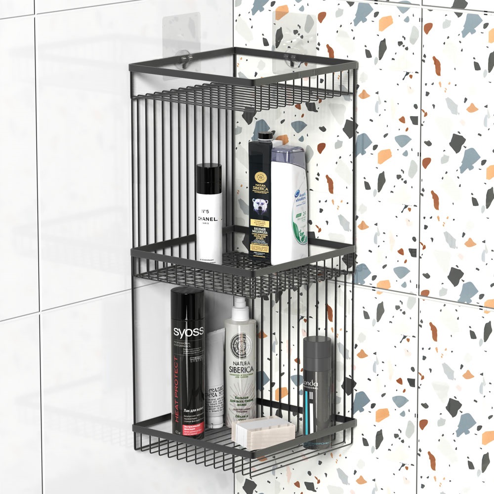 Тройная черная полка FORA "CONNECT" выполнена в оригинальном дизайне и отлично вписывается в интерьер современной ванной комнаты. Аксессуар изготовлен из металла с устойчивым к воздействию высоких температур и влажности покрытием. Полочка надежно фиксируется силиконовыми присосками на угол стены, а металлические бортики предотвращают падение банных принадлежностей.
