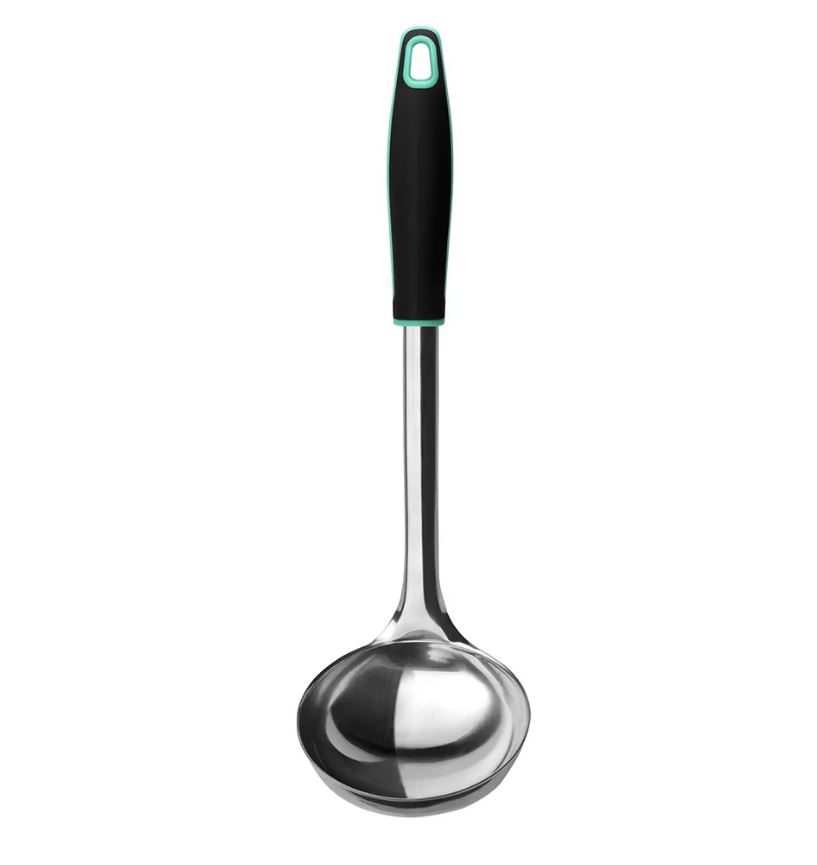Стальной половник с пластиковой ручкой. Имеет отверстие в ручке для удобства размещения на вертикальных поверхностях. Предназначен для разлива первых блюд, киселей, компотов. Подходит для мытья в посудомоечной машине.
