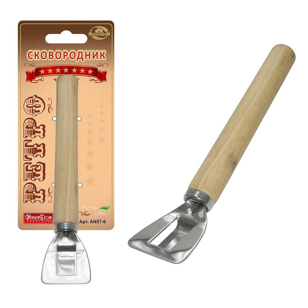 Прицепная часть сковородника изготовлена из нержавеющей стали, а сама ручка – из дерева.