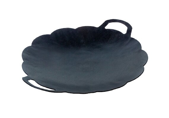 Садж из вороненого металла с коваными декоративными ручками. Садж изготавливается с помощью плазморезки.Воронение - это обработка стали подсолнечным маслом с последующим его прокаливанием на огне. Этот процесс делает садж более долговечным, защищая от коррозии и улучшая его внешний вид.Садж - это утварь восточной кухни, представляющая собой плоскую или вогнутую сковороду для приготовления пищи. Кроме того, садж на металлической подставке используется для подачи шашлыка и овощного гарнира, ведь это эффектно выглядит на столе!