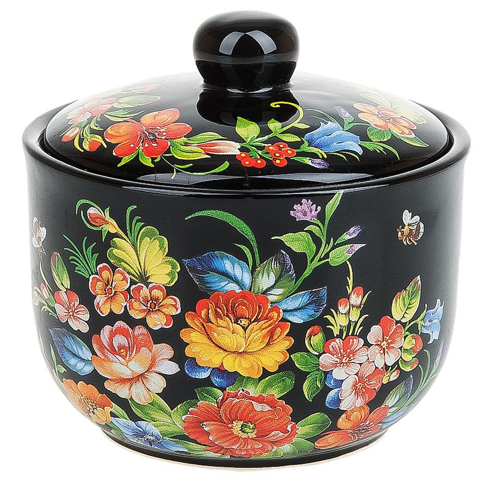 Сахарница "Романс" с крышкой изготовлена из керамики и украшена ярким рисунком.