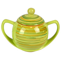 Сахарница из коллекции Витаминка имеет достаточно вместительный объем и большие ручки. Необычный дизайн изделия бросается в глаза. Возникает ощущение того, что сахарница состоит из двух частей – ручки линиями выходят из донышка и напоминают форму крыльев.