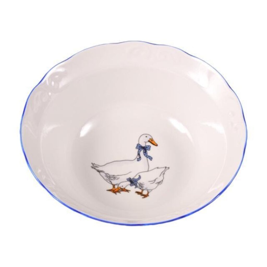 Большой салатник из фарфора прекрасно смотрится как самостоятельный элемент сервировки, так и в наборе с посудой из этой серии. Изделие декорировано рисунком Гуси, синей отводкой.