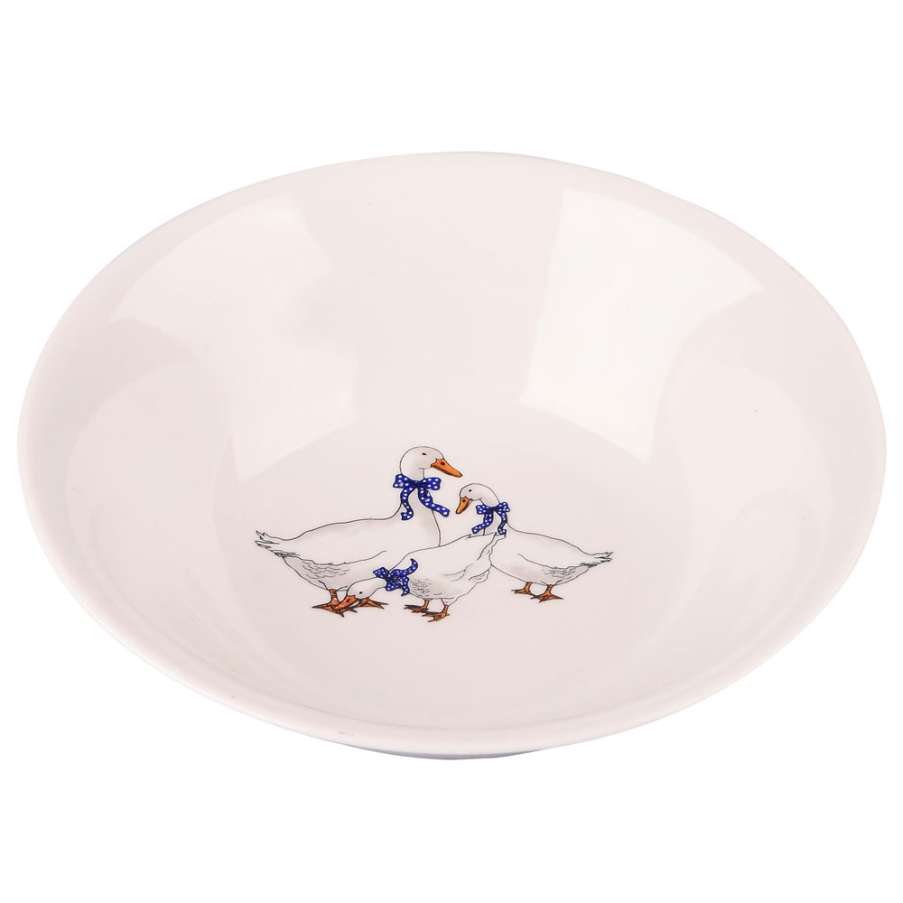 Салатник изготовлен из фарфора, имеет ровный край и декорирована узором Гуси (новые).