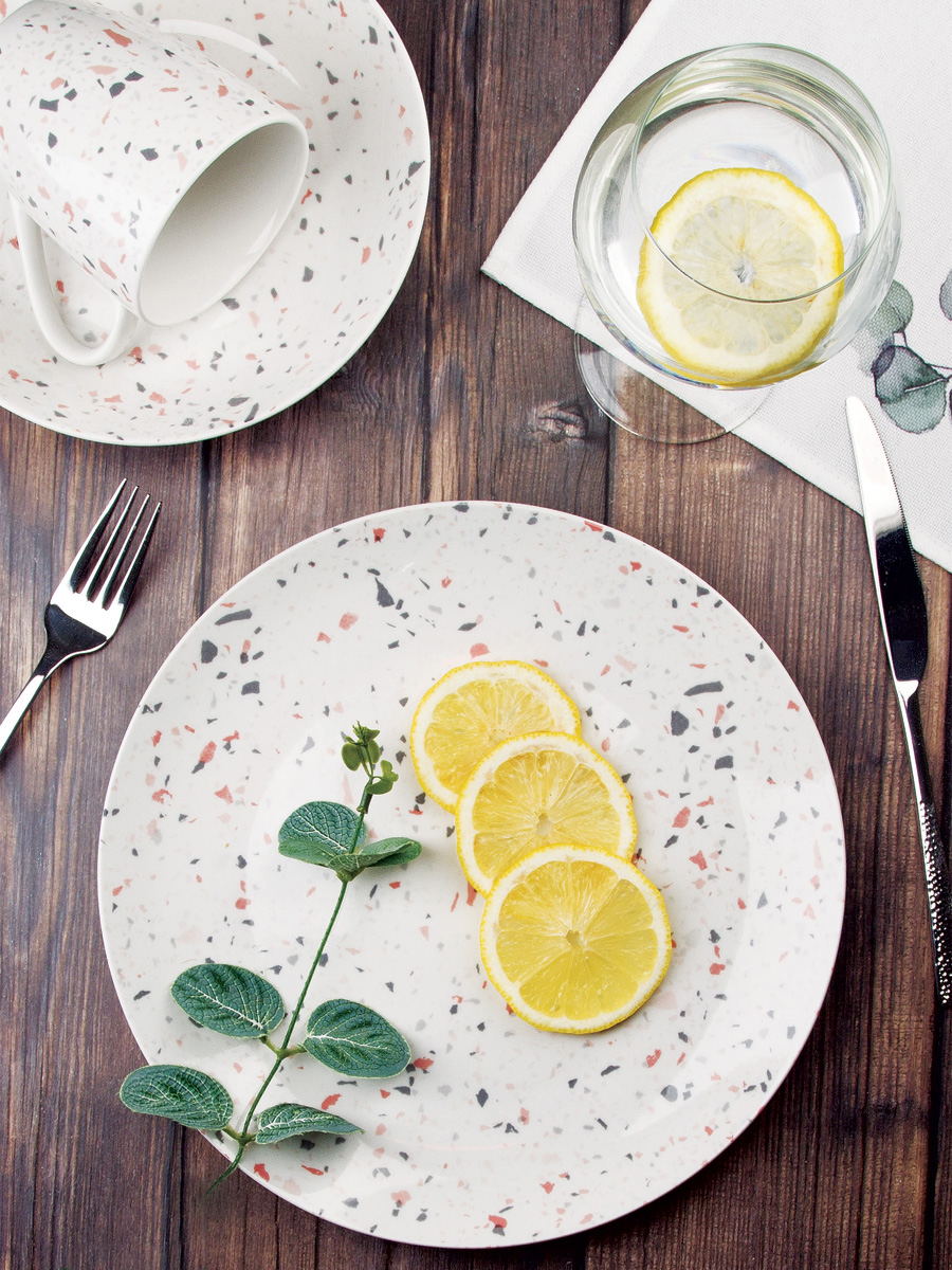 Коллекция «Мраморная крошка» с природными текстурами, которые органично впишутся в интерьер вашего дома. В коллекцию входят 4 предмета: тарелка диаметром 27 см, тарелка диаметром 19 cм, салатник диаметром 20 см и кружка 340 мл. Выполнены изделия из фарфора с глянцевой поверхностью. Посуду можно использовать в ПММ и СВЧ.