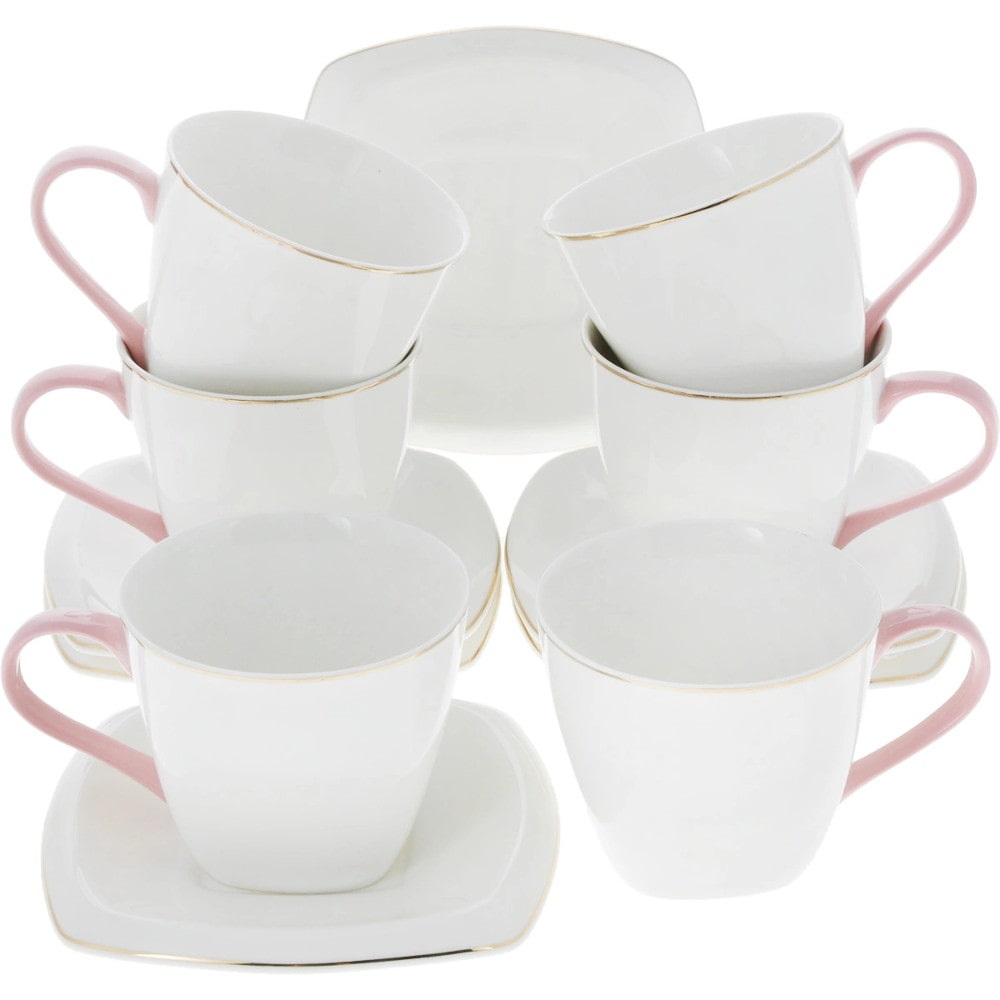Элегантный классический дизайн с тонкой золотой каймой делает этот набор прекрасным украшением любого стола. Ручки чашек выполнены в розовом цвете.