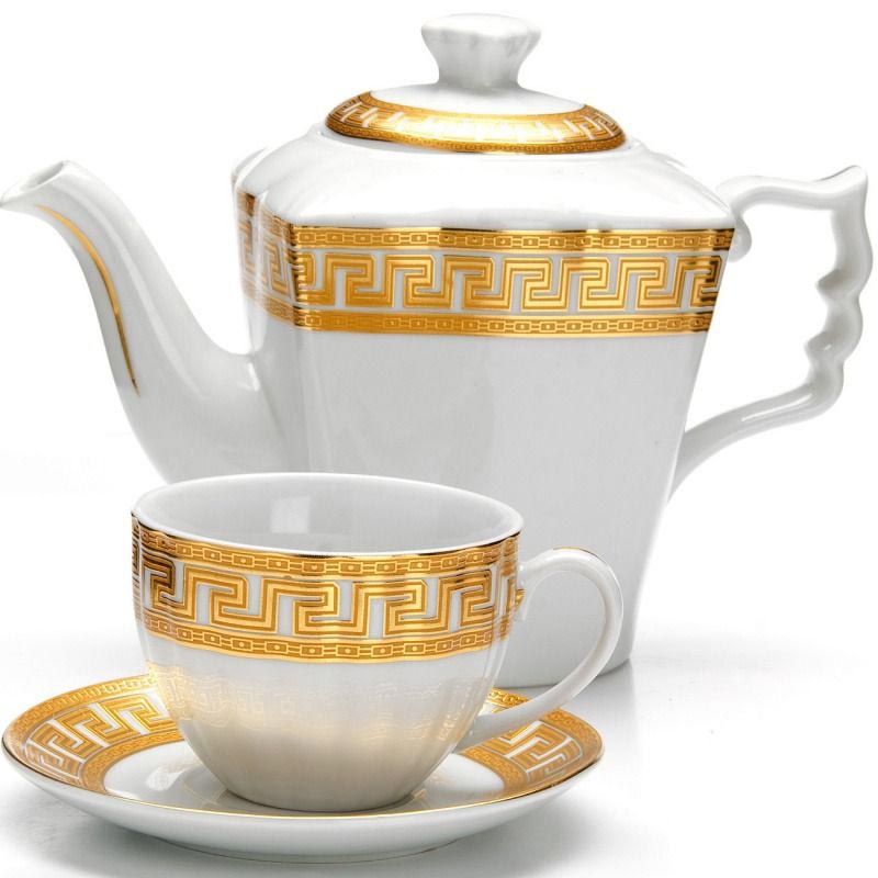 Чайный набор Loraine на 6 персон выполнен из высококачественного фарфора белого цвета и украшен золотым орнаментом.