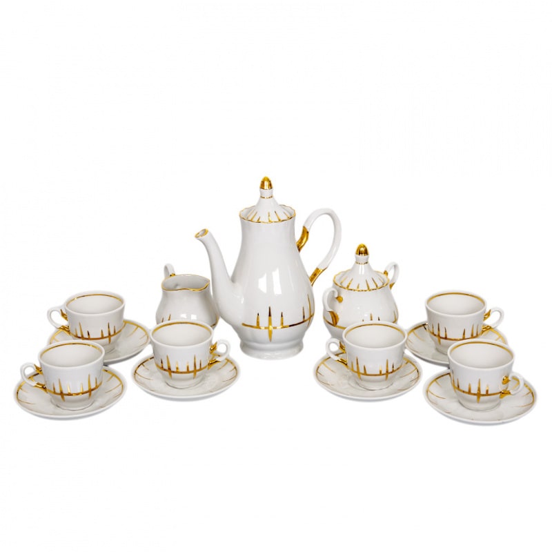 Кофейный сервиз "Солнечный" от известного белорусского бренда станет настоящим украшением вашего стола. Все изделия выполнены из фарфора и декорированы золотым рисунком.