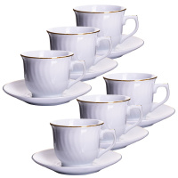 Кофейный набор на 6 персон LORAINE выполнен из высококачественной керамики - материала безопасного для здоровья и надолго сохраняющего тепло напитка.Несмотря на свою внешнюю хрупкость, каждый из предметов набора обладает высокой прочностью и надежностью. Элегантный классический дизайн с тонкой золотой каймой делает этот кофейный набор прекрасным украшением любого стола. Набор аккуратно упакован в подарочную упаковку, поэтому его можно