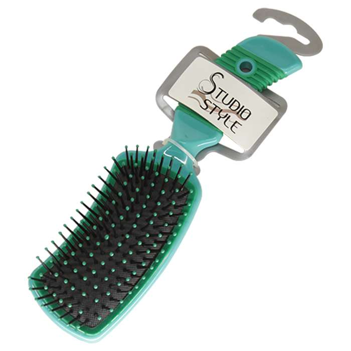 Массажная щетка изогнутой прямоугольной формы с эластичной подушкой и пластиковыми зубчиками удаляет загрязнения с волос, усиливает