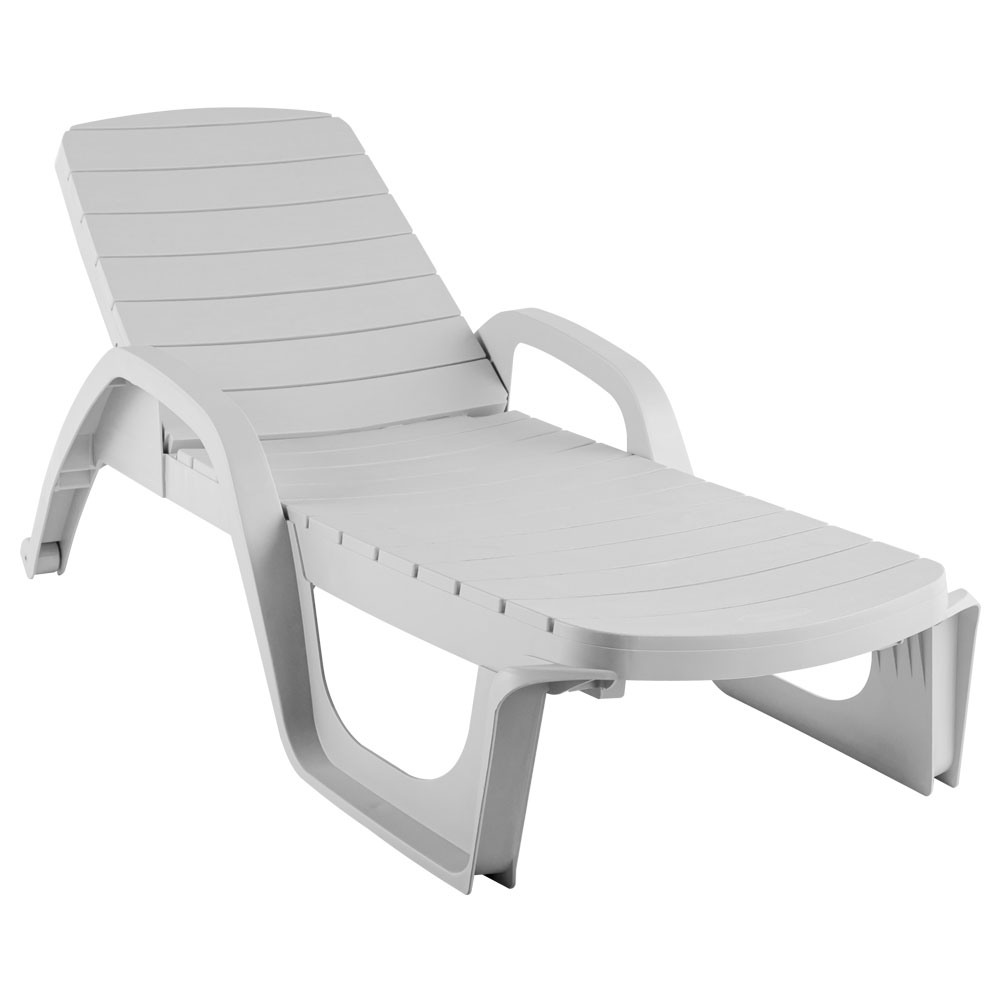 Шезлонг Прованс изготовлен из полипропилена белого цвета. Поверхность шезлонга матовая с имитацией структуры дерева. Максимальная нагрузка на изделие 150 кг. Спинка имеет 5 позиций регулировки угла наклона. Ширина основания (лежака) 65 см, высота лежака от пола 30 см, высота спинки в поднятом состоянии - 65 см. Шезлонг возможно штабелировать.