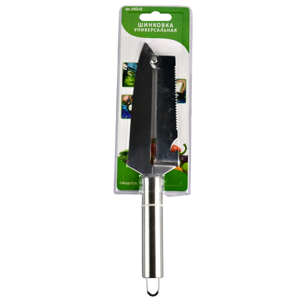 Шинковка МультидоМ — это универсальный инструмент, он сэкономит ваше время и силы в процессе нарезки капусты или других овощей. Изделие состоит из двух острых лезвий, что значительно сокращает время нарезки. С тыльной стороны расположена засечка, с помощью которой можно быстро открыть банки и бутылки. Лезвия изготовлены из коррозионностойкой (нержавеющей) стали, общая длина изделия 27,5 см.
