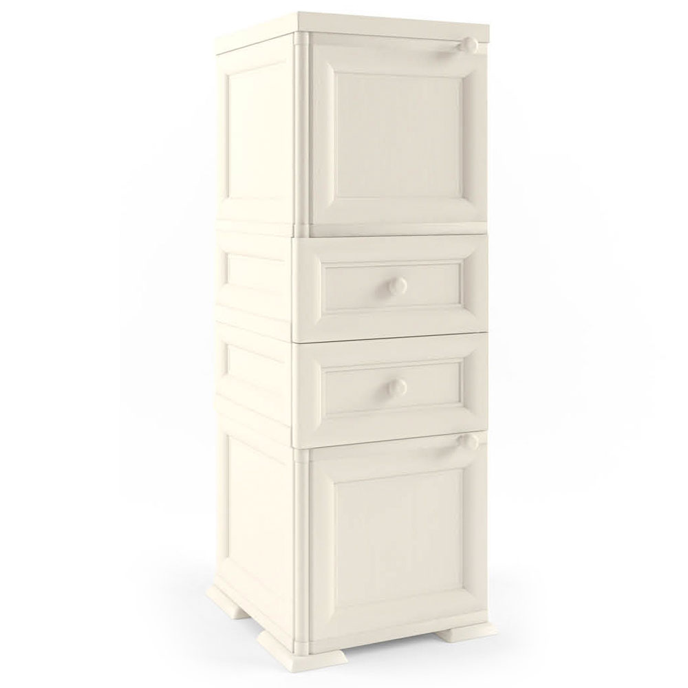 Шкаф от производителя Элластик-Пласт изготовлен из прочного пластика бежевого цвета. У представленной модели два узких выдвижных ящика и два широких распашных. Фасады гладкие.