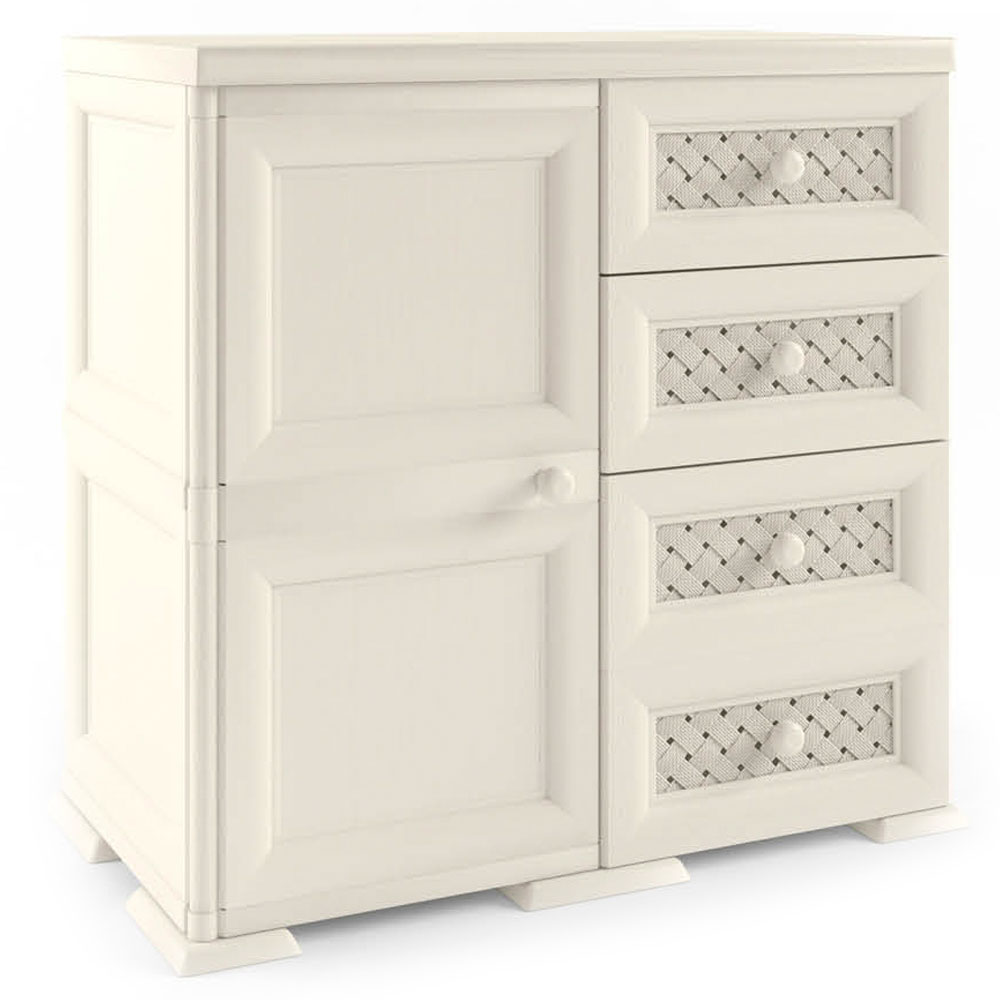 Шкаф пластиковый Э-110 с одним широким распашным ящиком и четырьмя узкими выдвижными ящиками. Фасад – смешанный (гладкий и плетенка).