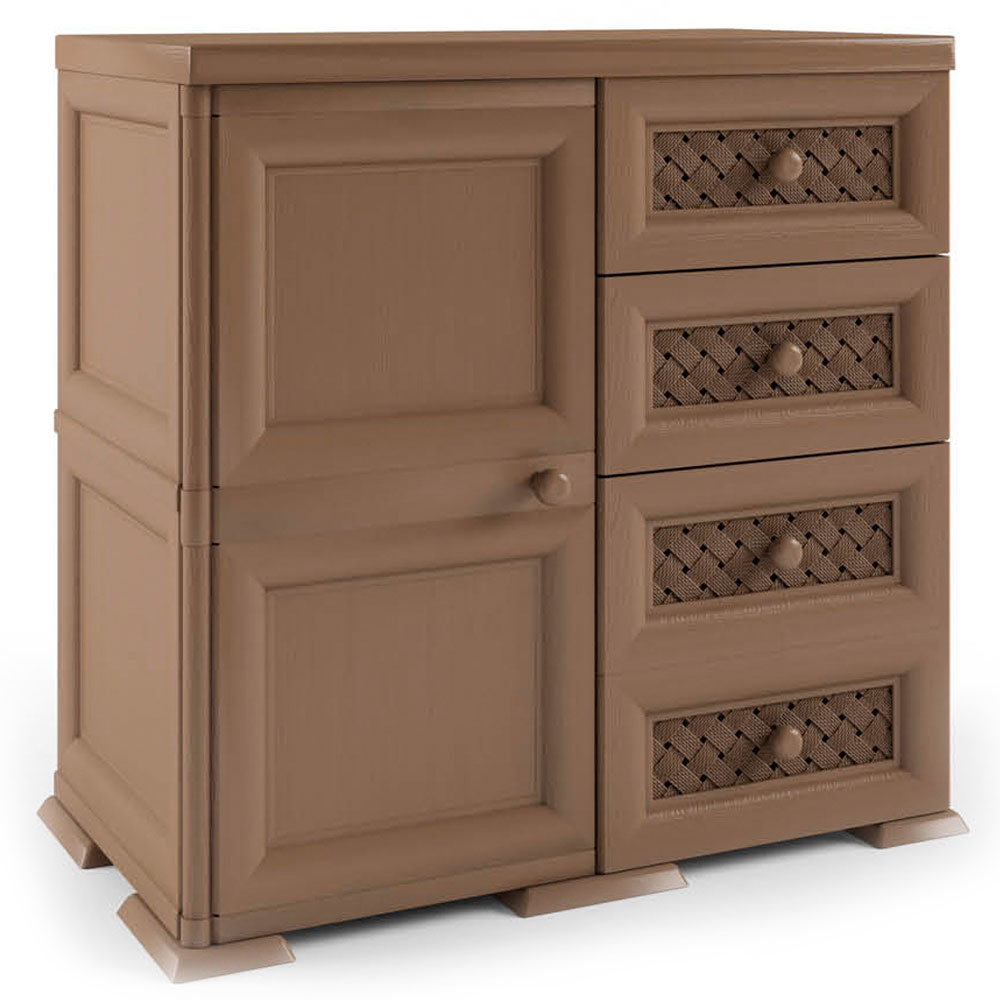 Шкаф пластиковый Э-110 с одним широким распашным ящиком и четырьмя узкими выдвижными ящиками. Фасад – смешанный (гладкий и плетенка).