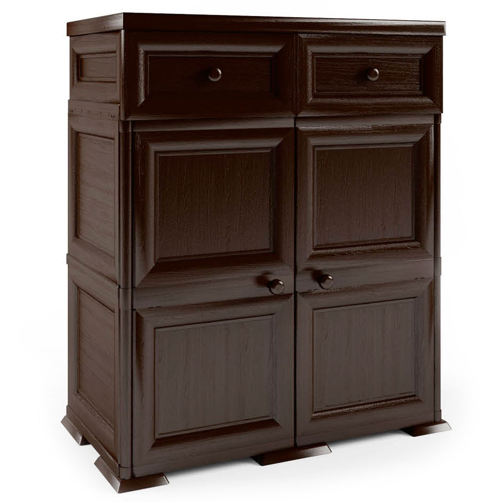 Шкаф пластиковый Э-117 с двумя широкими распашными ящиками и двумя узкими выдвижными ящиками. Фасад – гладкий. Распашные дверцы в закрытом виде фиксируются при помощи магнитов.