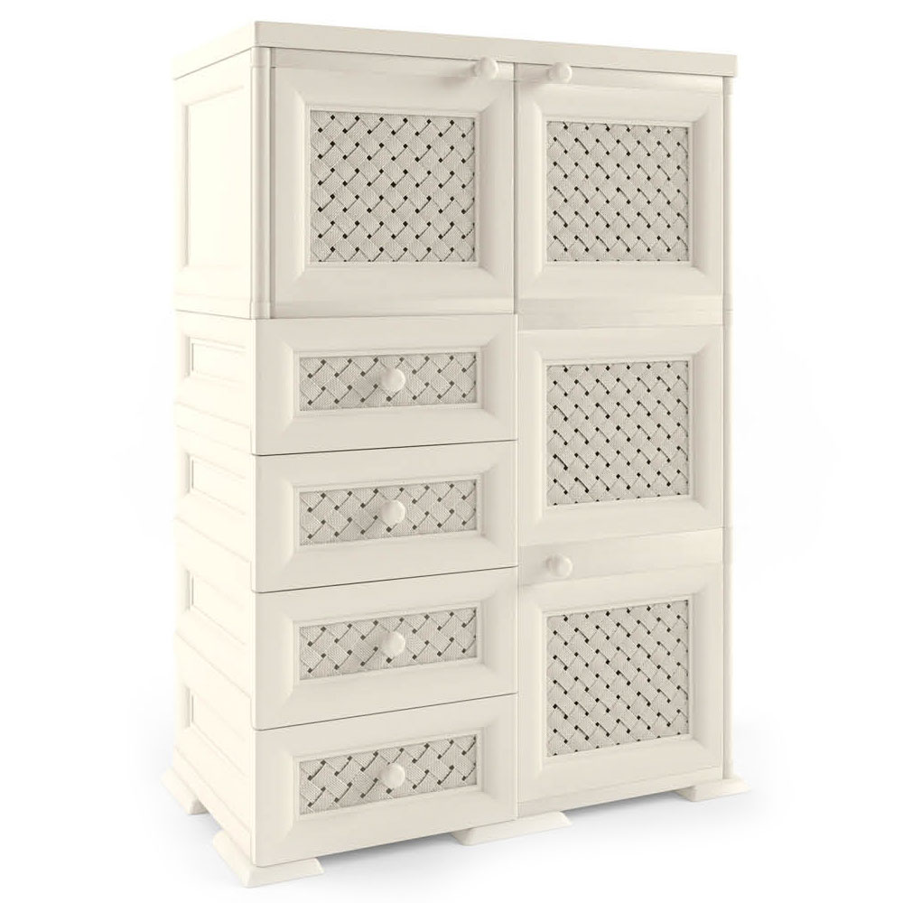 Шкаф пластиковый Э-130 от производителя Элластик-Пласт имеет фасады Плетенка. Распашные дверцы в закрытом виде фиксируются при помощи магнитов. Выдвижные ящики имеют очень плавный ход.