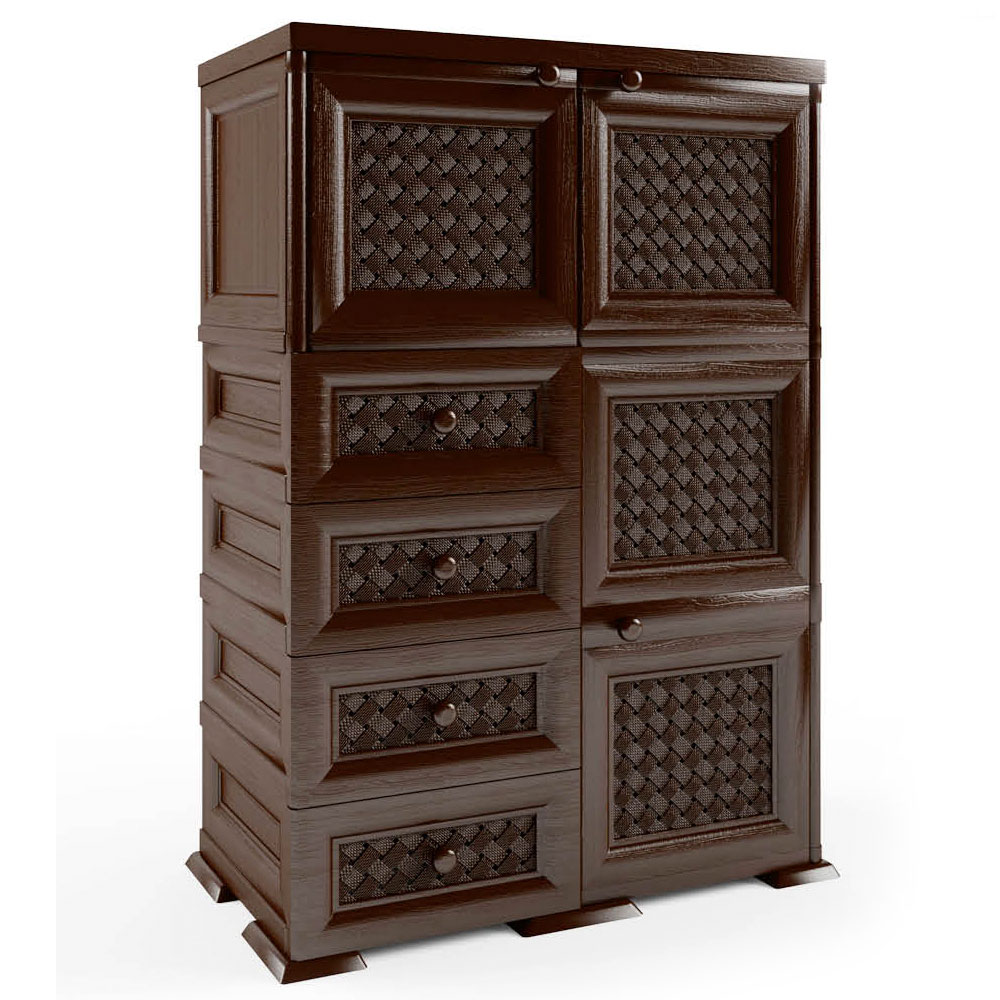 Шкаф пластиковый Э-130 от производителя Элластик-Пласт имеет фасады Плетенка. Распашные дверцы в закрытом виде фиксируются при помощи магнитов. Выдвижные ящики имеют очень плавный ход.