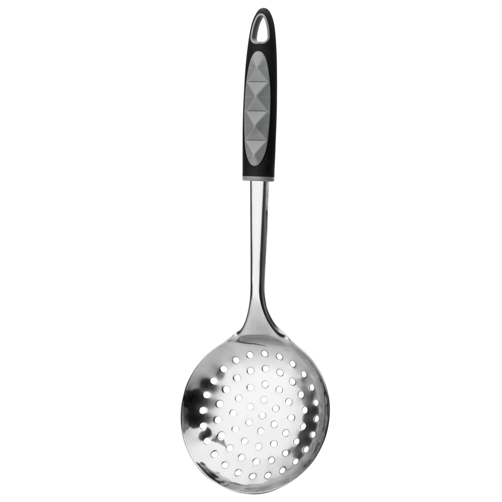 Шумовка из нержавеющей стали с отверстиями удобного размера, позволяет легко и быстро снимать пену и доставать вареники или пельмени по несколько штук.