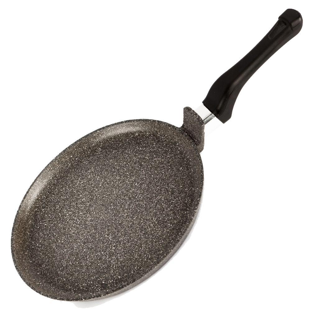 Сковорода блинная литая алюминиевая с пластиковой несъемной ручкой и утолщенным дном.