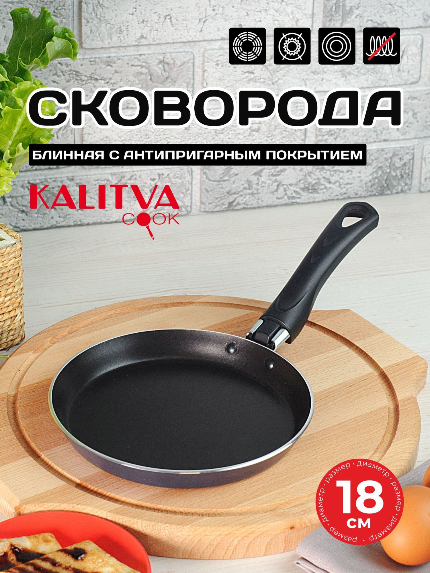 Сковорода блинная "Калитва" 18см изготовлена из алюминия с антипригарным покрытием.