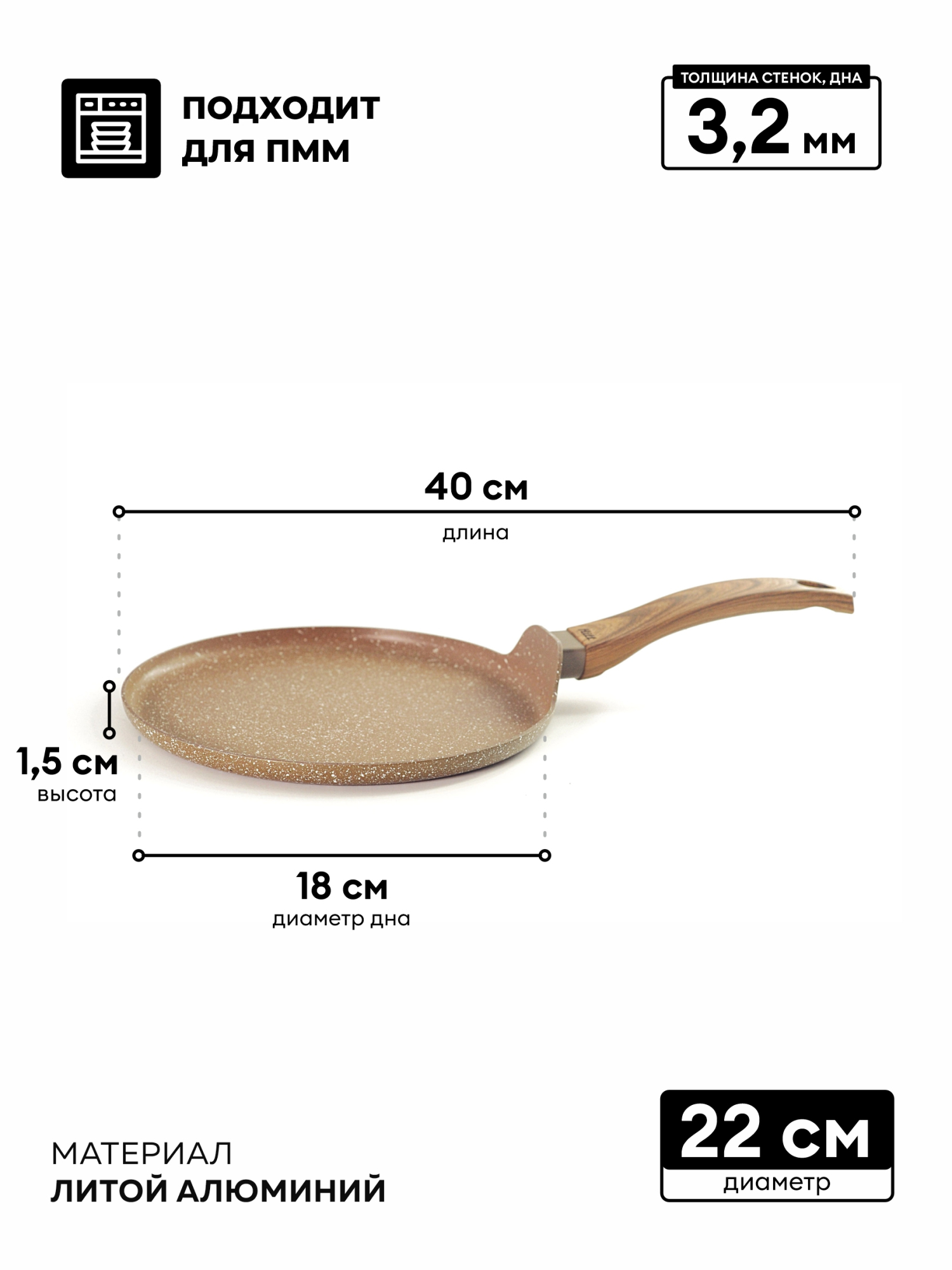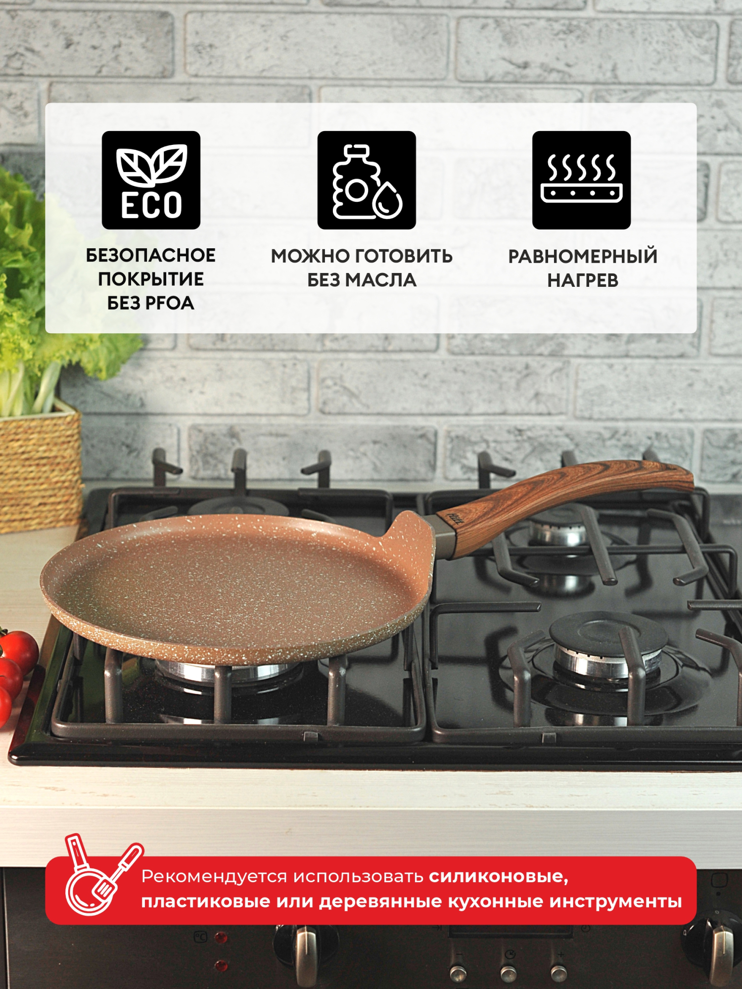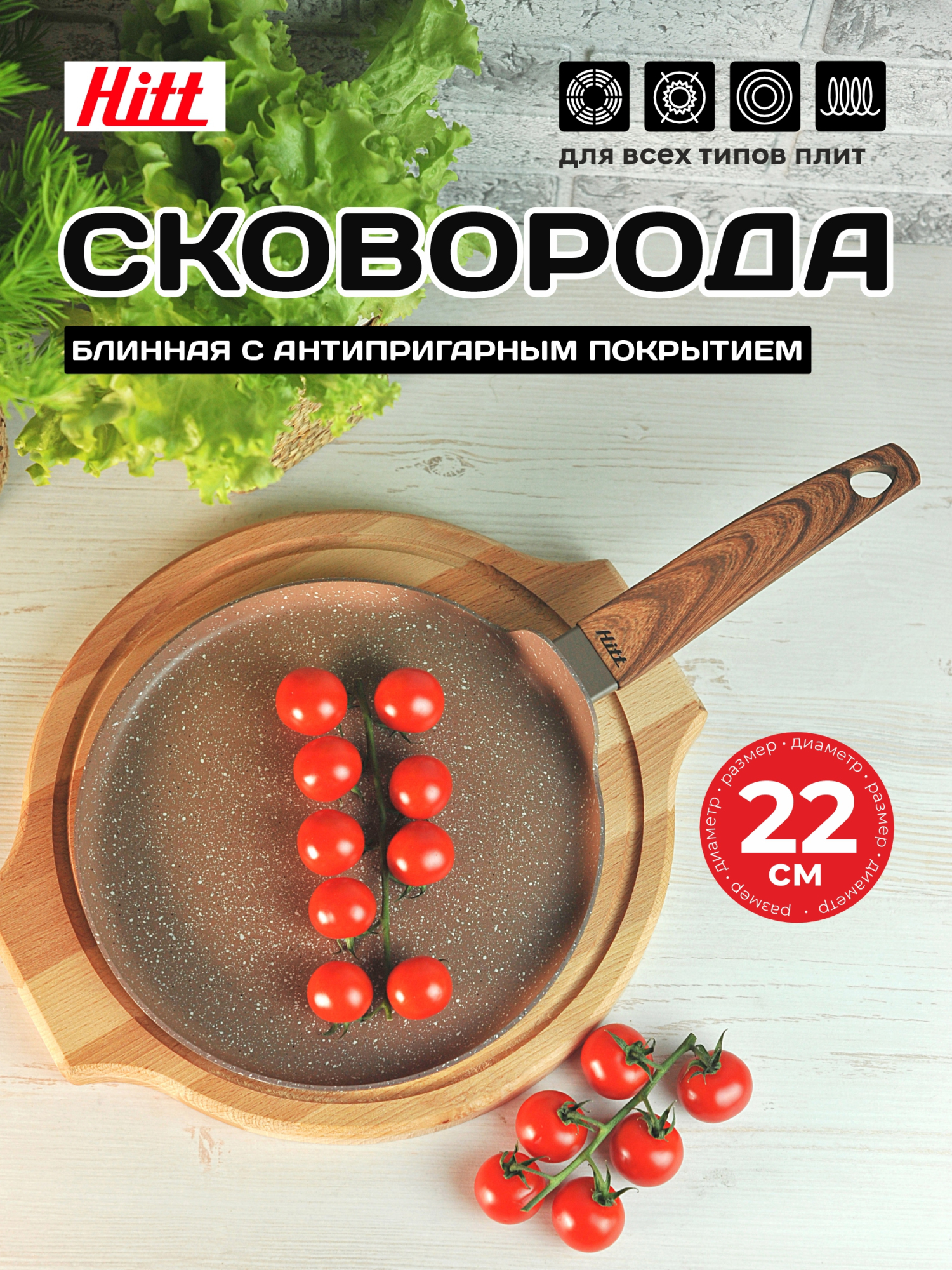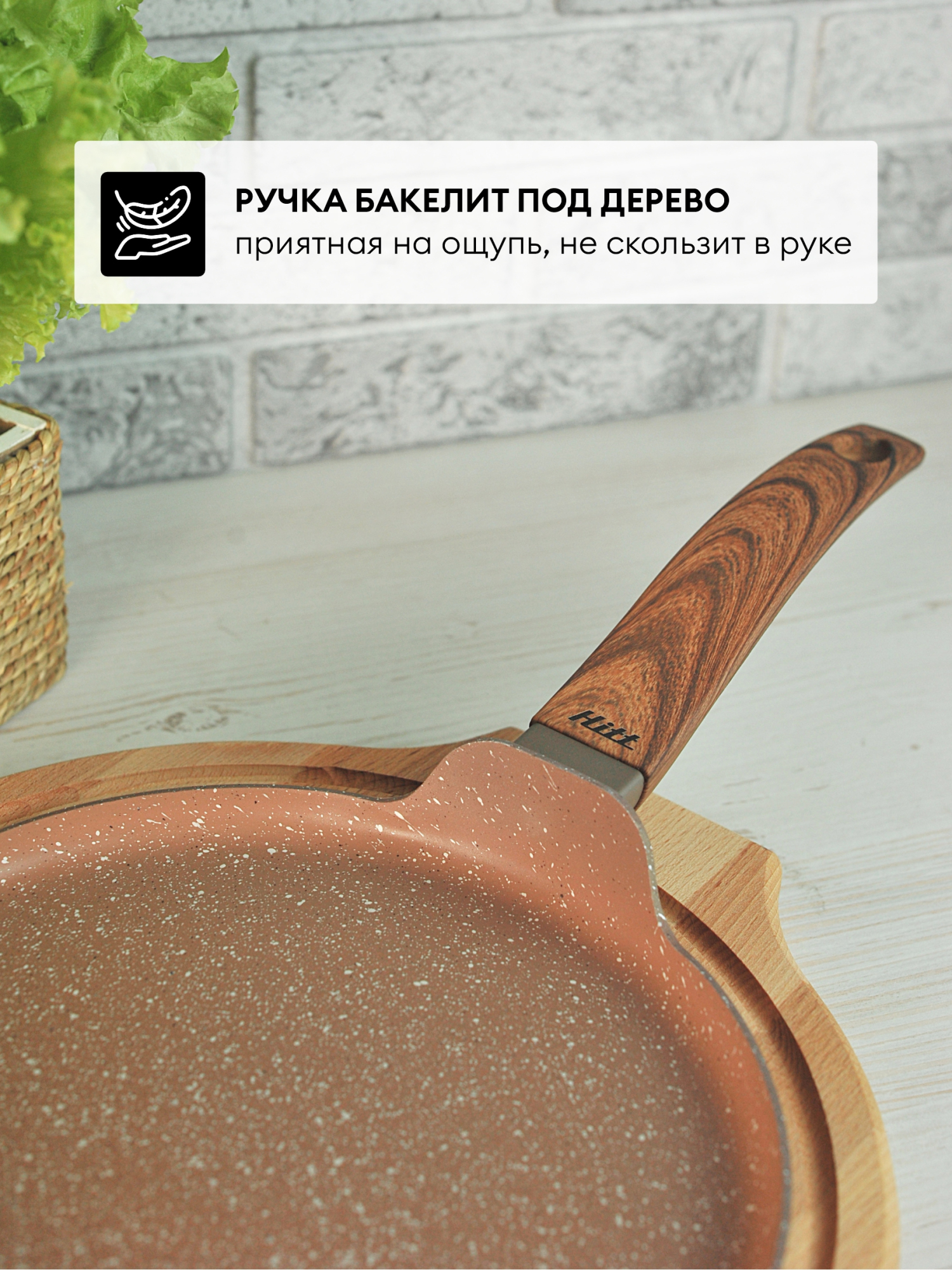 Ручка с мягким силиконовым покрытием, имитирующим древесную фактуру, не нагревается и не скользит. Идеально подходит для приготовления низкокалорийных блюд или для жарки и тушения с минимальным количеством масла. Для всех типов плит, в том числе индукционных.