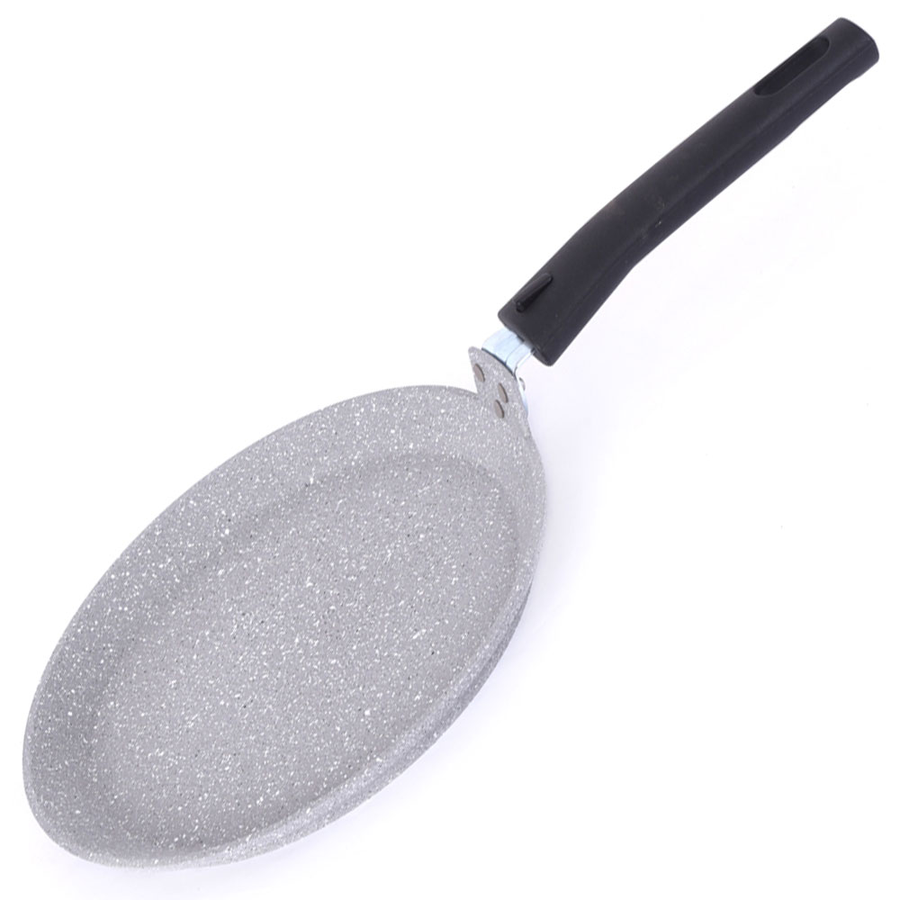 Блинная сковорода от бренда Kukmara изготовлена из литого алюминия и покрыта инновационным антипригарным мраморным покрытием на водной основе, усиленным сверхтвердыми частицами минералов.