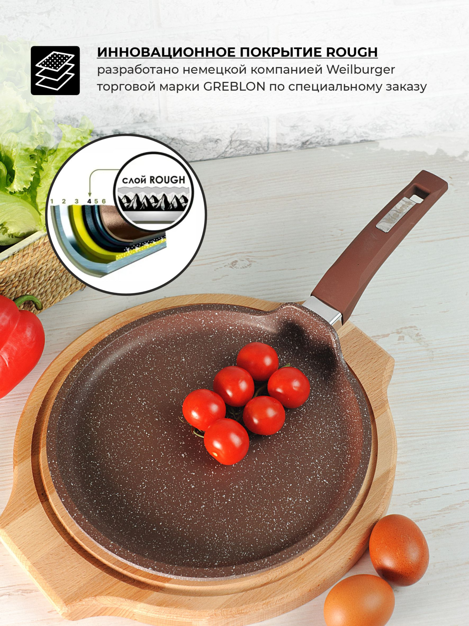 Толщина покрытия до 55 мкр. Позволяет готовить с минимальным количеством масла, сохраняя вкусовые и полезные свойства продуктов
