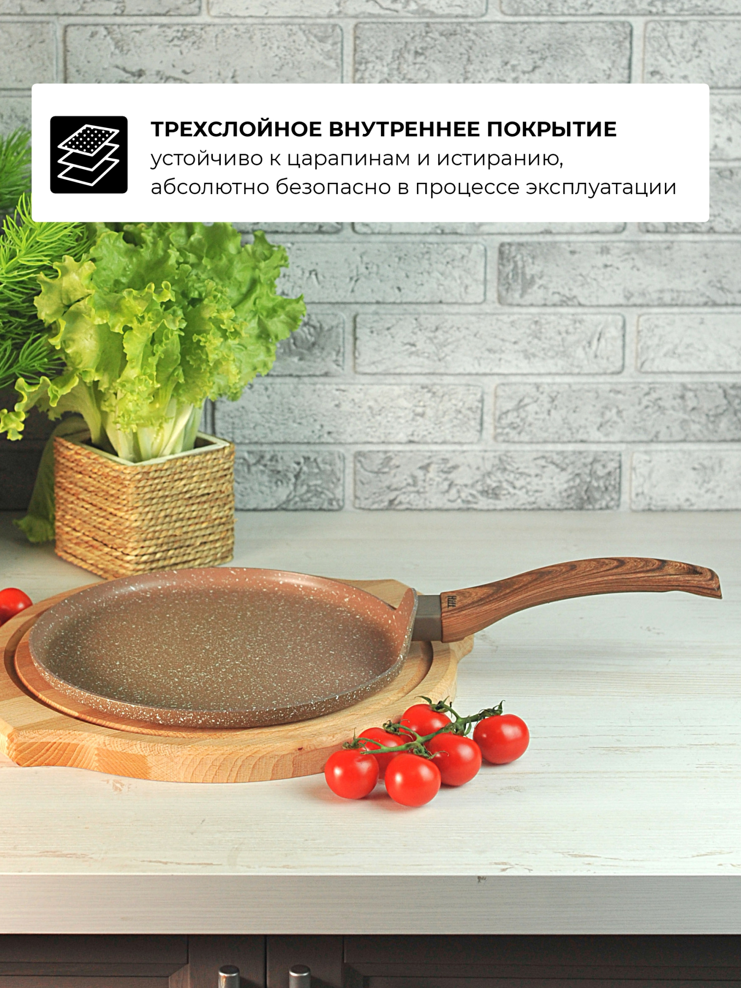 Ручка с мягким силиконовым покрытием, имитирующим древесную фактуру, не нагревается и не скользит. Идеально подходит для приготовления низкокалорийных блюд или для жарки и тушения с минимальным количеством масла. Для всех типов плит, в том числе индукционных.