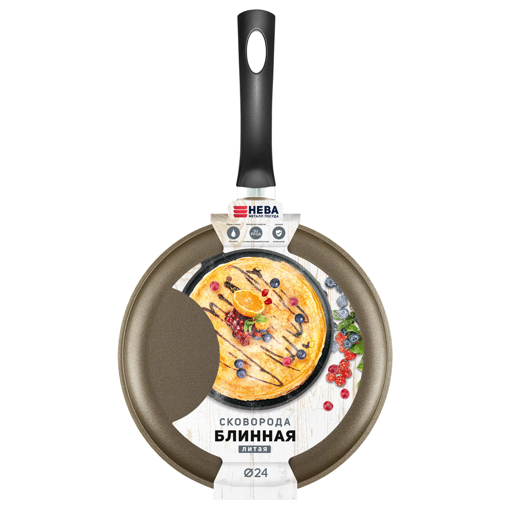Блинница "Нева-металл" изготовлена из литого алюминия с антипригарным покрытием на водной основе. Антипригарное покрытие на водной основе относится к самому безопасному, четвертому классу по ГОСТу. Оно традиционно производится без использования PFOA (перфтороктановой кислоты).