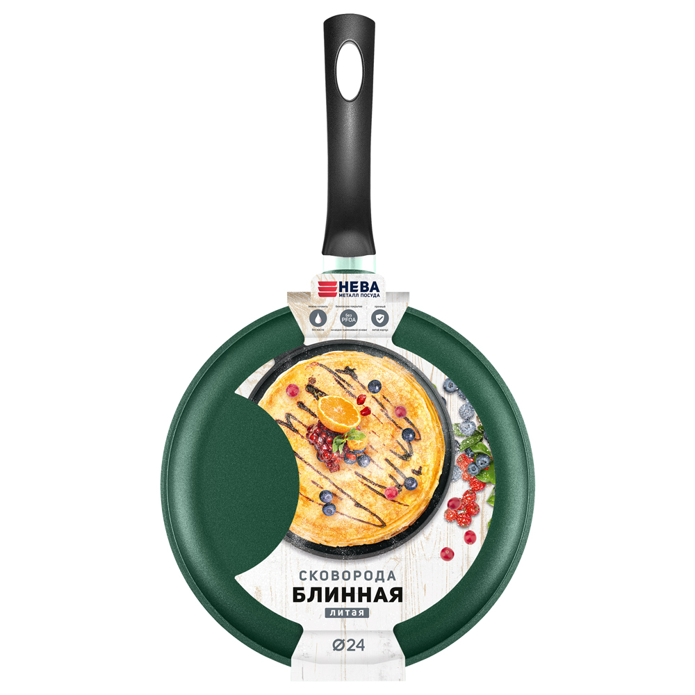 Блинница "Нева-металл" изготовлена из литого алюминия с антипригарным покрытием на водной основе. Антипригарное покрытие на водной основе относится к самому безопасному, четвертому классу по ГОСТу. Оно традиционно производится без использования PFOA (перфтороктановой кислоты).