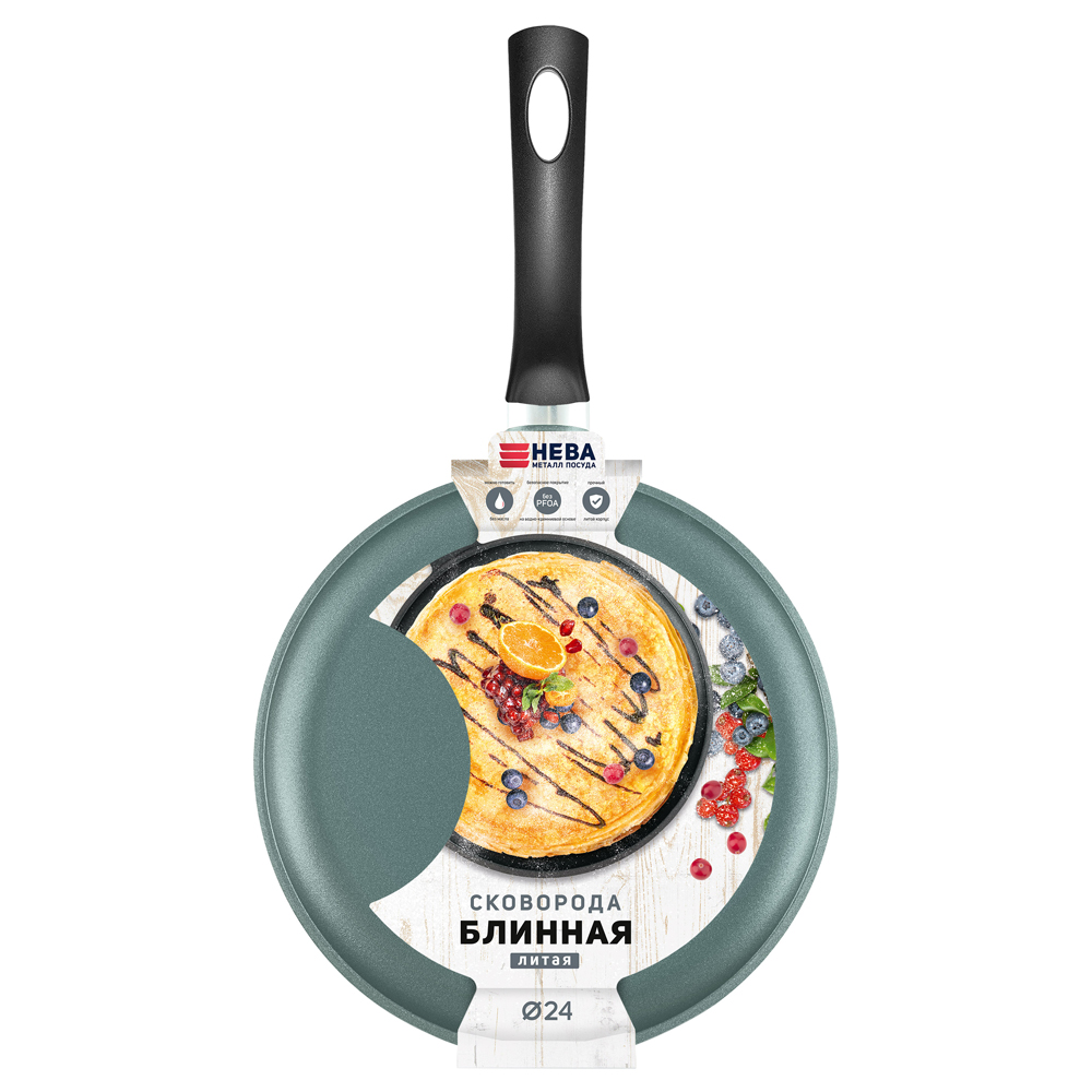 Блинница "Нева-металл" изготовлена из литого алюминия с антипригарным покрытием на водной основе. Антипригарное покрытие на водной основе относится к самому безопасному, четвертому классу по ГОСТу. Оно традиционно производится без использования PFOA (перфтороктановой кислоты).