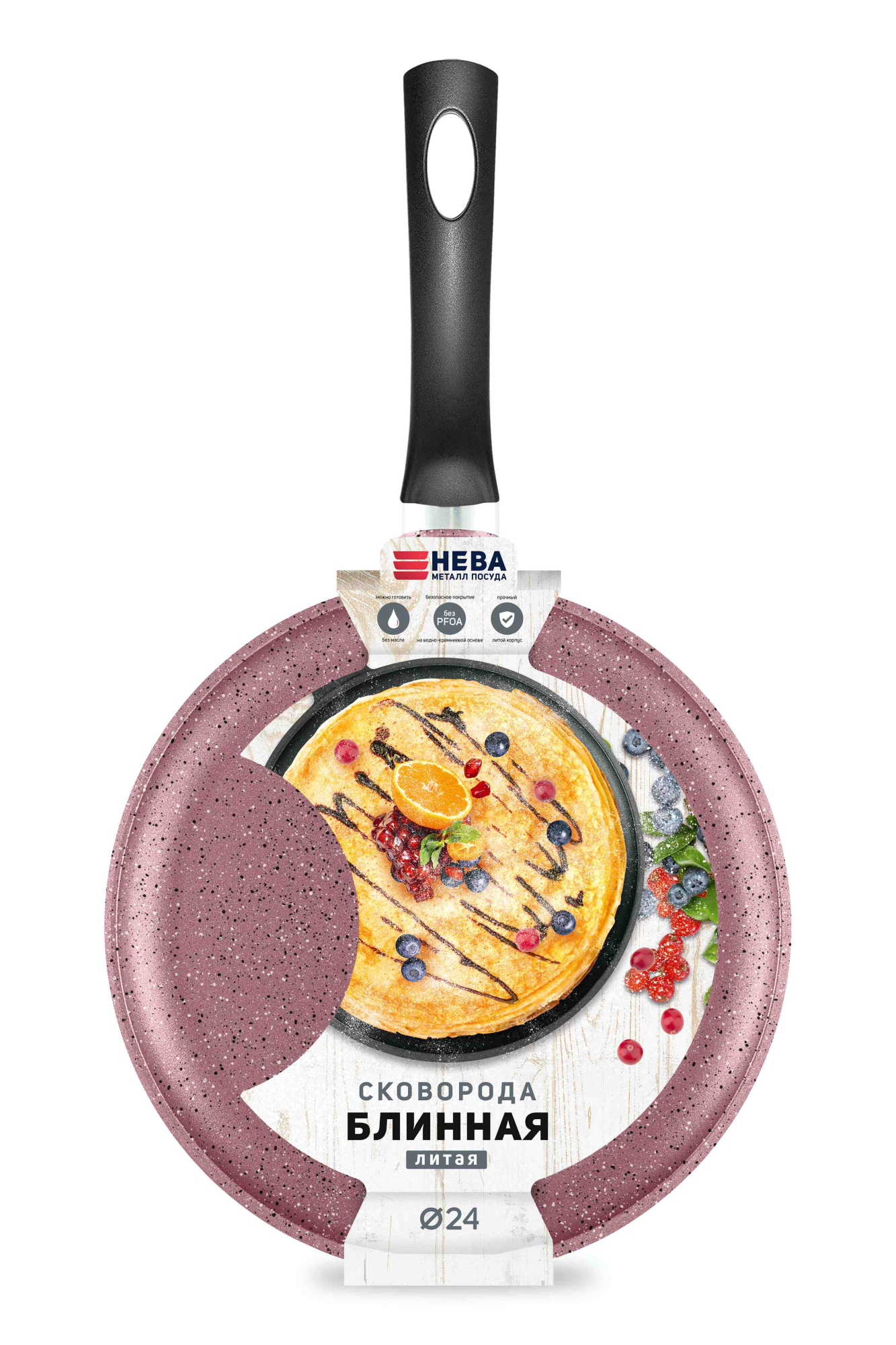 Литой алюминиевый корпус не подвержен деформации и обеспечивает равномерный нагрев. Многослойное покрытие усилено минеральными частицами, долго сохраняет антипригарные свойства. Низкий борт позволяет легко переворачивать и снимать блины.
