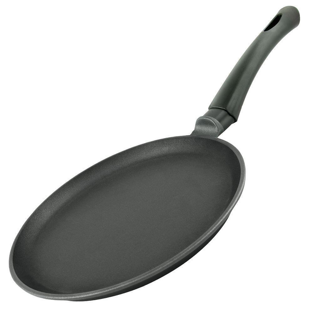 Утолщенное дно обеспечивает особые термоаккумулирующие свойства: блин равномерно пропекается по всей толщине и красиво румянится с обеих сторон. Благодаря антипригарному покрытию блины всегда легко снимаются со сковороды и не пригорают, даже при выпекании без использования масла.
